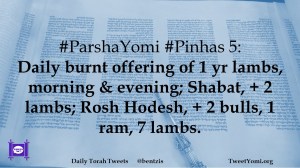 #ParshaYomi #Pinhas 5: Daily burnt offering of 1 yr lambs, morning & evening; Shabat, + 2 lambs; Rosh Hodesh, + 2 bulls, 1 ram, 7 lambs.