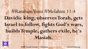 #RambamYomi #Melahim 11:4 Davidic king, observes Torah, gets Israel to follow, fights God’s wars, builds Temple, gathers exile, he’s Masiah.