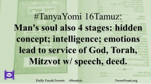 #TanyaYomi 16Tamuz: Man’s soul also 4 stages: hidden concept; intelligence; emotions lead to service of God, Torah, Mitzvot w/ speech, deed.