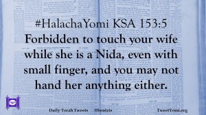 #HalachaYomi KSA 153:5 Forbidden to touch your wife while she is a Nida, even with small finger, and you may not hand her anything either.