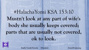#HalachaYomi KSA 153:10 Mustn’t look at any part of wife’s body she usually keeps covered; parts that are usually not covered, ok to look.