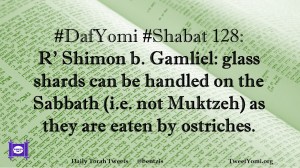 DafYomi, Shabat #DafYomi #Shabat 128 Date: July 13, 2020Author: ysspitz #DafYomi #Shabat 128: R’ Shimon b. Gamliel: glass shards can be handled on the Sabbath (i.e. not Muktzeh) as they are eaten by ostriches. Share this: Share on X (Opens in new window) X Share on Facebook (Opens in new window) Facebook Like Loading... Related
