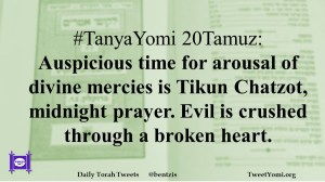 #TanyaYomi 20Tamuz: Auspicious time for arousal of divine mercies is Tikun Chatzot, midnight prayer. Evil is crushed through a broken heart.
