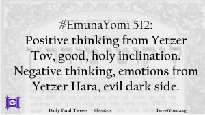 #EmunaYomi 512: Positive thinking from Yetzer Tov, good, holy inclination. Negative thinking, emotions from Yetzer Hara, evil dark side.