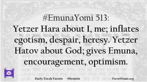 #EmunaYomi 513: Yetzer Hara about I, me; inflates egotism, despair, heresy. Yetzer Hatov about God; gives Emuna, encouragement, optimism.
