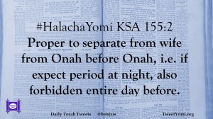 #HalachaYomi KSA 155:2 Proper to separate from wife from Onah before Onah, i.e. if expect period at night, also forbidden entire day before.