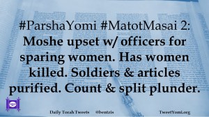#ParshaYomi #MatotMasai 2: Moshe upset w/ officers for sparing women. Has women killed. Soldiers & articles purified. Count & split plunder.