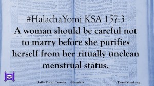 #HalachaYomi KSA 157:3 A woman should be careful not to marry before she purifies herself from her ritually unclean menstrual status.