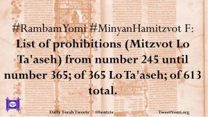 #RambamYomi #MinyanHamitzvot F: List of prohibitions (Mitzvot Lo Ta’aseh) from number 245 until number 365; of 365 Lo Ta’aseh; of 613 total.