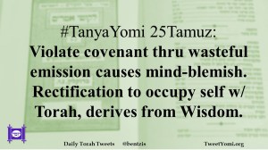 #TanyaYomi 25Tamuz: Violate covenant thru wasteful emission causes mind-blemish. Rectification to occupy self w/ Torah, derives from Wisdom.