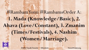 #RambamYomi #RambamsOrder A: 1. Mada (Knowledge/Basic), 2. Ahava (Love/Constant), 3. Zmanim (Times/Festivals), 4. Nashim (Women/Marriage).