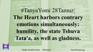 #TanyaYomi 28Tamuz: The Heart harbors contrary emotions simultaneously: humility, the state Tshuva Tata’a, as well as gladness.