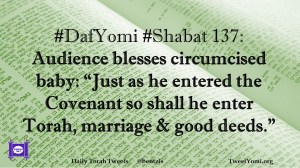 DafYomi, Shabat #DafYomi #Shabat 137 Date: July 21, 2020Author: ysspitz #DafYomi #Shabat 137: Audience blesses circumcised baby: “Just as he entered the Covenant so shall he enter Torah, marriage & good deeds.” Share this: Share on X (Opens in new window) X Share on Facebook (Opens in new window) Facebook Like Loading... Related