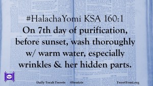 #HalachaYomi KSA 160:1 On 7th day of purification, before sunset, wash thoroughly w/ warm water, especially wrinkles & her hidden parts.