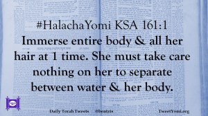 #HalachaYomi KSA 161:1 Immerse entire body & all her hair at 1 time. She must take care nothing on her to separate between water & her body.