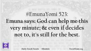 EmunaYomi #EmunaYomi 523 Date: July 24, 2020Author: ysspitz #EmunaYomi 523: Emuna says: God can help me this very minute; & even if decides not to, it’s still for the best. Share this: Share on X (Opens in new window) X Share on Facebook (Opens in new window) Facebook Like Loading... Related