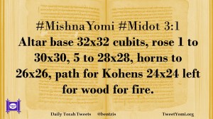 #MishnaYomi #Midot 3:1 Altar base 32×32 cubits, rose 1 to 30×30, 5 to 28×28, horns to 26×26, path for Kohens 24×24 left for wood for fire.