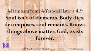 #RambamYomi #YesodeiHatora 4:9 Soul isn’t of elements. Body dies, decomposes, soul remains. Knows things above matter, God, exists forever.