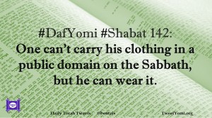 DafYomi, Shabat #DafYomi #Shabat 142 Date: July 27, 2020Author: ysspitz #DafYomi #Shabat 142: One can’t carry his clothing in a public domain on the Sabbath, but he can wear it. Share this: Share on X (Opens in new window) X Share on Facebook (Opens in new window) Facebook Like Loading... Related