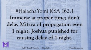 #HalachaYomi KSA 162:1 Immerse at proper time; don’t delay Mitzva of propogation even 1 night; Joshua punished for causing delay of 1 night.