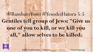 #RambamYomi #YesodeiHatora 5:5 Gentiles tell group of Jews: “Give us one of you to kill, or we kill you all,” allow selves to be killed.