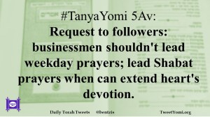 #TanyaYomi 5Av: Request to followers: businessmen shouldn’t lead weekday prayers; lead Shabat prayers when can extend heart’s devotion.