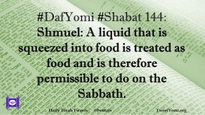 DafYomi, Shabat #DafYomi #Shabat 144 Date: August 1, 2020Author: ysspitz #DafYomi #Shabat 144: Shmuel: A liquid that is squeezed into food is treated as food and is therefore permissible to do on the Sabbath. Share this: Share on X (Opens in new window) X Share on Facebook (Opens in new window) Facebook Like Loading... Related