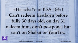 #HalachaYomi KSA 164:3 Can’t redeem firstborn before fully 30 days old; on day 31 redeem him, don’t postpone; but can’t on Shabat or YomTov.