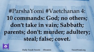 #ParshaYomi #Vaetchanan 4: 10 commands: God; no others; don’t take in vain; Sabbath; parents; don’t: murder; adultery; steal; false; covet.