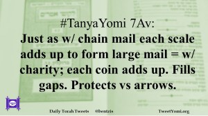 #TanyaYomi 7Av: Just as w/ chain mail each scale adds up to form large mail = w/ charity; each coin adds up. Fills gaps. Protects vs arrows.