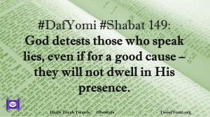 DafYomi, Shabat #DafYomi #Shabat 149 Date: August 2, 2020Author: ysspitz #DafYomi #Shabat 149: God detests those who speak lies, even if for a good cause – they will not dwell in His presence. Share this: Share on X (Opens in new window) X Share on Facebook (Opens in new window) Facebook Like Loading... Related