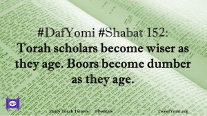 DafYomi, Shabat #DafYomi #Shabat 152 Date: August 5, 2020Author: ysspitz #DafYomi #Shabat 152: Torah scholars become wiser as they age. Boors become dumber as they age. Share this: Share on X (Opens in new window) X Share on Facebook (Opens in new window) Facebook Like Loading... Related