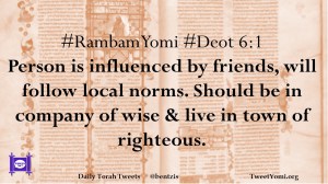 #RambamYomi #Deot 6:1 Person is influenced by friends, will follow local norms. Should be in company of wise & live in town of righteous.
