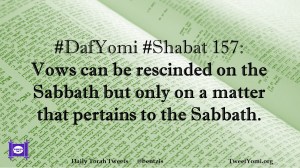 DafYomi, Shabat #DafYomi #Shabat 157 Date: August 10, 2020Author: ysspitz #DafYomi #Shabat 157: Vows can be rescinded on the Sabbath but only on a matter that pertains to the Sabbath. Share this: Share on X (Opens in new window) X Share on Facebook (Opens in new window) Facebook Like Loading... Related
