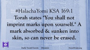#HalachaYomi KSA 169:1 Torah states “You shall not imprint marks upon yourself.” A mark absorbed & sunken into skin, so can never be erased.