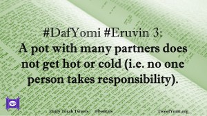 DafYomi, Eruvin #DafYomi #Eruvin 3 Date: August 12, 2020Author: ysspitz #DafYomi #Eruvin 3: A pot with many partners does not get hot or cold (i.e. no one person takes responsibility). Share this: Share on X (Opens in new window) X Share on Facebook (Opens in new window) Facebook Like Loading... Related