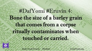 DafYomi, Eruvin #DafYomi #Eruvin 4 Date: August 14, 2020Author: ysspitz #DafYomi #Eruvin 4: Bone the size of a barley grain that comes from a corpse ritually contaminates when touched or carried. Share this: Share on X (Opens in new window) X Share on Facebook (Opens in new window) Facebook Like Loading... Related