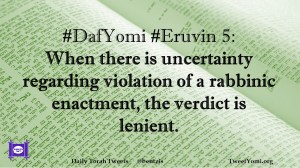DafYomi, Eruvin #DafYomi #Eruvin 5 Date: August 14, 2020Author: ysspitz #DafYomi #Eruvin 5: When there is uncertainty regarding violation of a rabbinic enactment, the verdict is lenient. Share this: Share on X (Opens in new window) X Share on Facebook (Opens in new window) Facebook Like Loading... Related