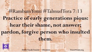 #RambamYomi #TalmudTora 7:13 Practice of early generations pious: hear their shame, not answer; pardon, forgive person who insulted them.