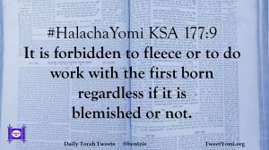 HalachaYomi #HalachaYomi KSA 177:9 Date: August 19, 2020Author: ysspitz #HalachaYomi KSA 177:9 It is forbidden to fleece or to do work with the first born regardless if it is blemished or not. Share this: Share on X (Opens in new window) X Share on Facebook (Opens in new window) Facebook Like Loading... Related
