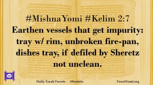 #MishnaYomi #Kelim 2:7 Earthen vessels that get impurity: tray w/ rim, unbroken fire-pan, dishes tray, if defiled by Sheretz not unclean.