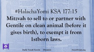 #HalachaYomi KSA 177:15 Mitzvah to sell to or partner with Gentile on clean animal (before it gives birth), to exempt it from 1stborn laws.