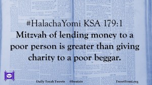 HalachaYomi #HalachaYomi KSA 179:1 Date: August 21, 2020Author: ysspitz #HalachaYomi KSA 179:1 Mitzvah of lending money to a poor person is greater than giving charity to a poor beggar. Share this: Share on X (Opens in new window) X Share on Facebook (Opens in new window) Facebook Like Loading... Related
