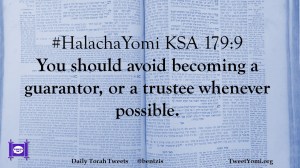 HalachaYomi #HalachaYomi KSA 179:9 Date: August 24, 2020Author: ysspitz #HalachaYomi KSA 179:9 You should avoid becoming a guarantor, or a trustee whenever possible. Share this: Share on X (Opens in new window) X Share on Facebook (Opens in new window) Facebook Like Loading... Related