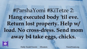 #ParshaYomi #KiTetze 2: Hang executed body ’til eve. Return lost property. Help w/ load. No cross-dress. Send mom away b4 take eggs, chicks.