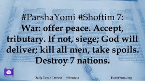 #ParshaYomi #Shoftim 7: War: offer peace. Accept, tributary. If not, siege; God will deliver; kill all men, take spoils. Destroy 7 nations.