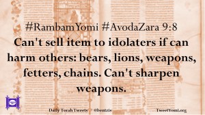 #RambamYomi #AvodaZara 9:8 Can’t sell item to idolaters if can harm others: bears, lions, weapons, fetters, chains. Can’t sharpen weapons.
