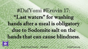 DafYomi, Eruvin #DafYomi #Eruvin 17 Date: August 26, 2020Author: ysspitz #DafYomi #Eruvin 17: “Last waters” for washing hands after a meal is obligatory due to Sodomite salt on the hands that can cause blindness. Share this: Share on X (Opens in new window) X Share on Facebook (Opens in new window) Facebook Like Loading... Related