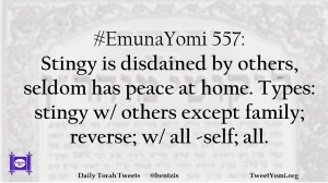 #EmunaYomi 557: Stingy is disdained by others, seldom has peace at home. Types: stingy w/ others except family; reverse; w/ all -self; all.