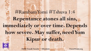 #RambamYomi #Tshuva 1:4 Repentance atones all sins, immediately or over time. Depends how severe. May suffer, need Yom Kipur or death.